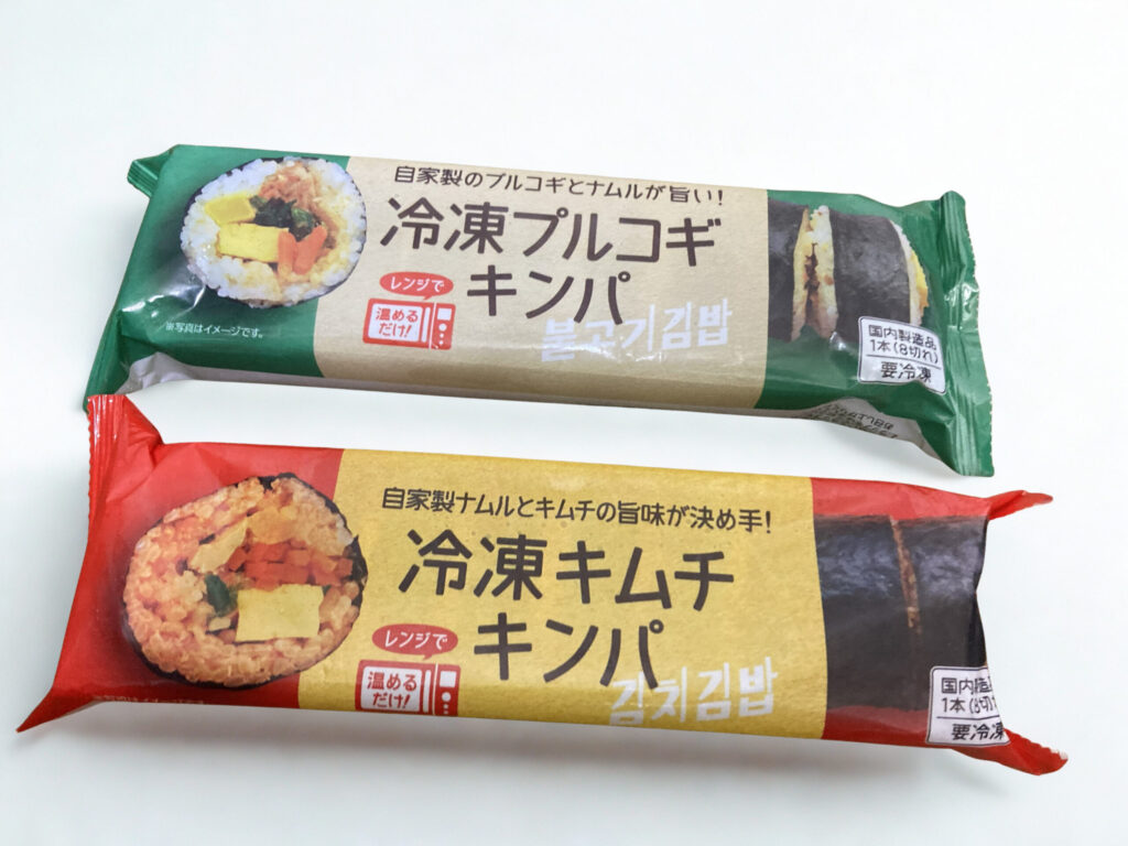 業務スーパーの冷凍キンパには定番の「プルコギキンパ」とピリ辛の「キムチキンパ」の2種類が商品一覧に並んでいます。