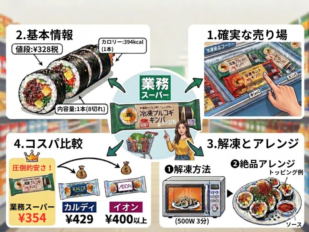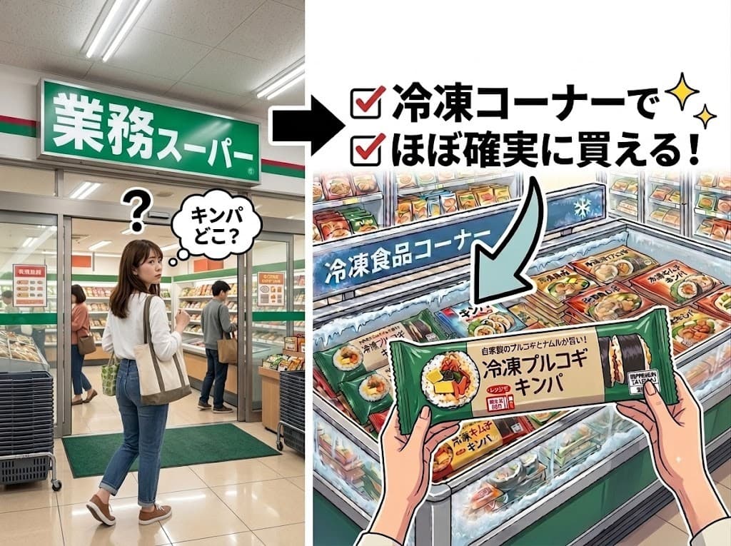 この記事では、「業務スーパーのキンパはどこに売ってる?」という店内の迷子状態をスッキリ解決して最高に美味しく食べるコツを解説します。