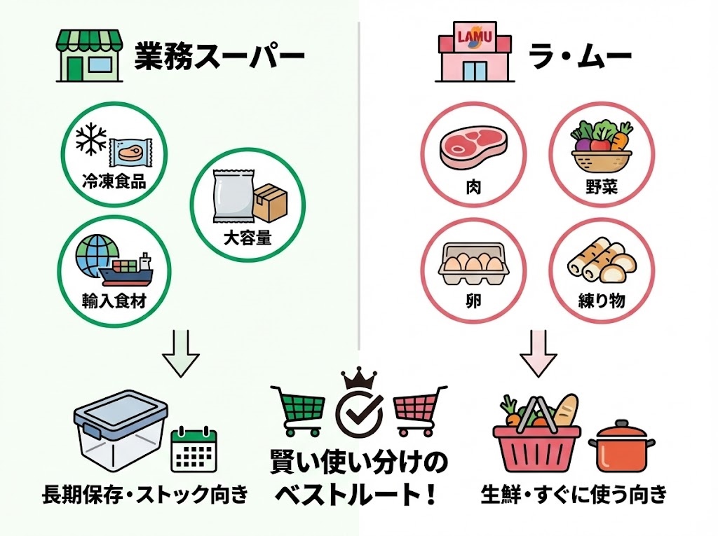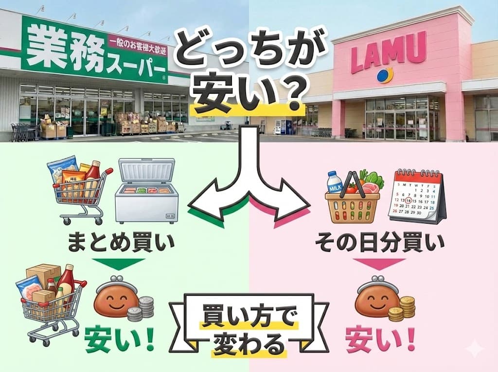 まとめ:業務スーパーとラ・ムーどっちが安いかは「肉・惣菜」か「冷凍・大容量」かで決まる