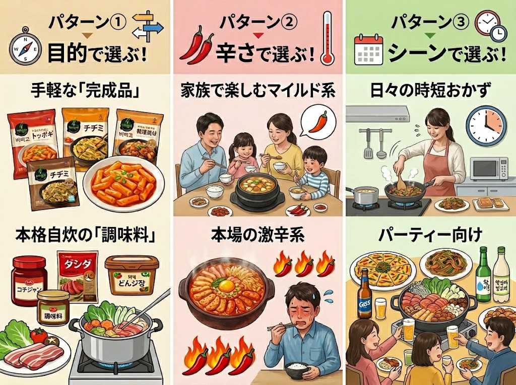 業務スーパーの韓国食材はどれがいいかと悩んだときの結論は、自分の目的や辛さの好みに合わせてカテゴリを選ぶことです。