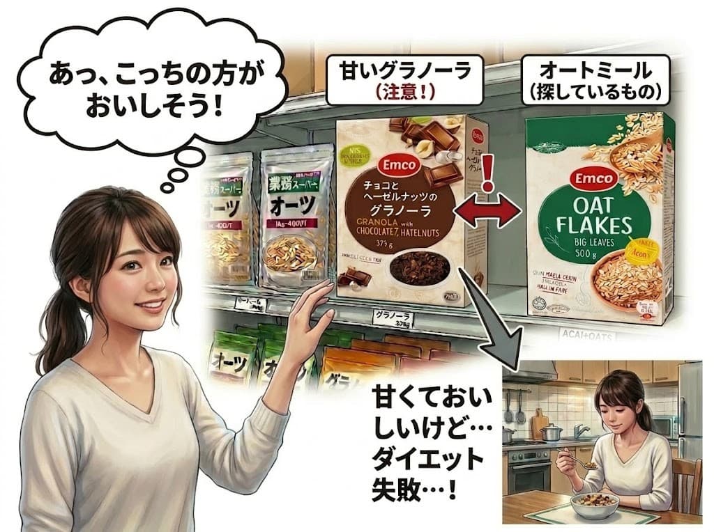 業務スーパーのオートミール売り場には、パッケージが似ている「甘いグラノーラ」が並んでいるという初心者が陥りやすい罠があります。