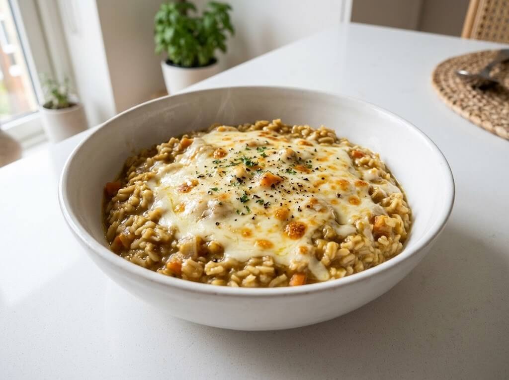 私の一押しは「濃厚チーズカレーリゾット」です。米化したオートミールにレトルトカレー(余り物でも可)と牛乳少々、とろけるチーズをのせて再度レンジでチン。