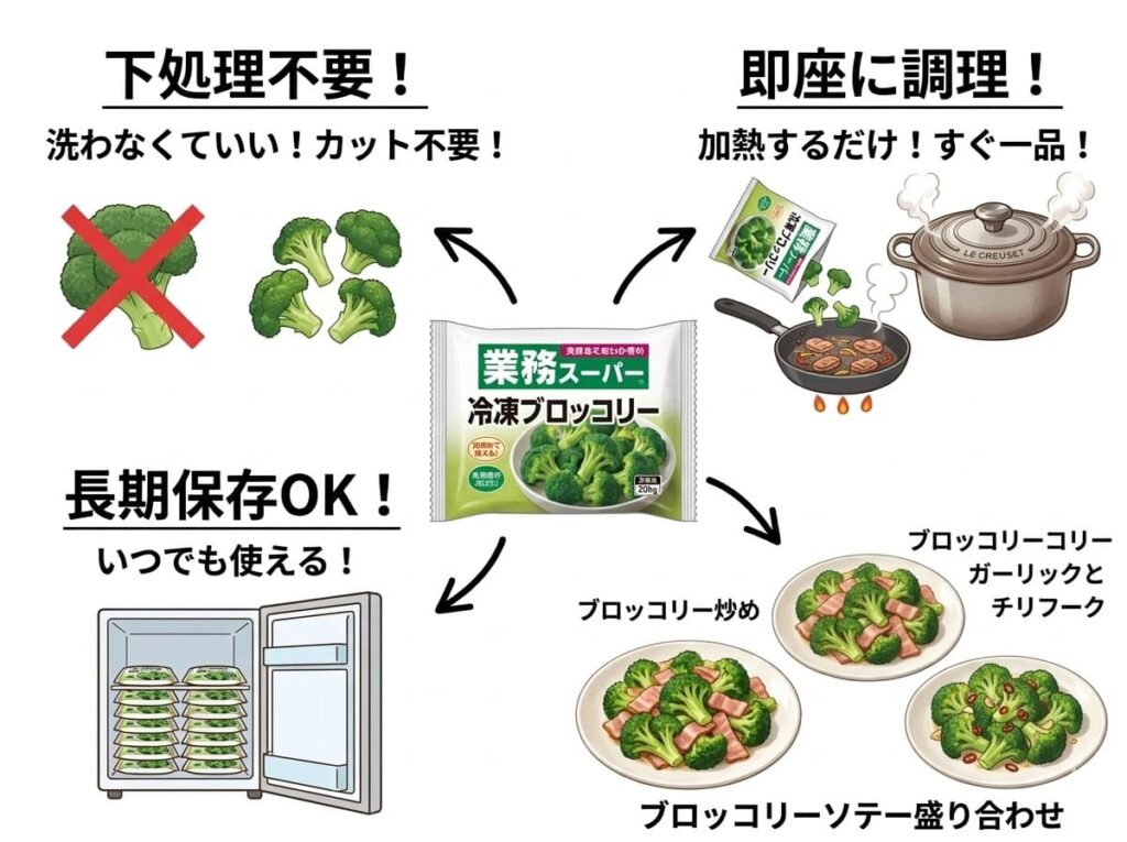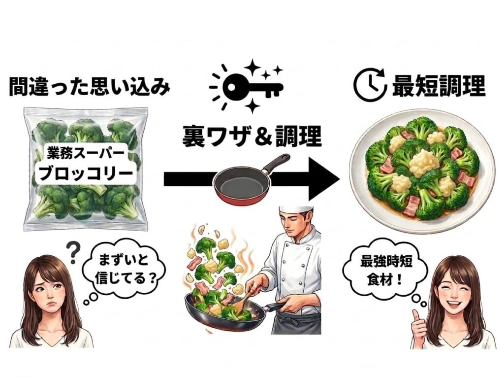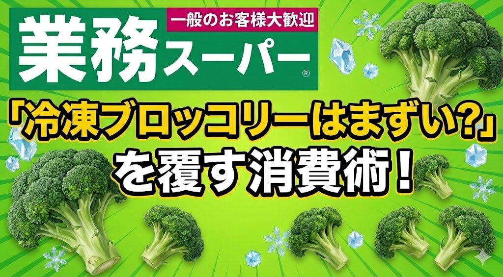 業務スーパーの冷凍ブロッコリーがまずいという課題は解凍しない調理法で完全に克服でき、圧倒的な安さと時短で家計を救う、主夫必見の神食材であることがわかります。