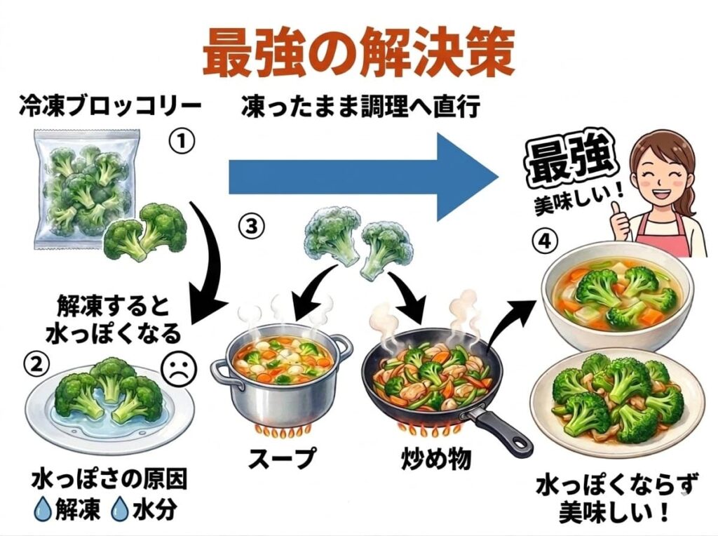 冷凍ブロッコリーのまずい食感と水っぽさを完全に隠蔽するには、解凍せずにスープにしたり乾煎りして濃い味で炒めたりするレシピが最適です。
