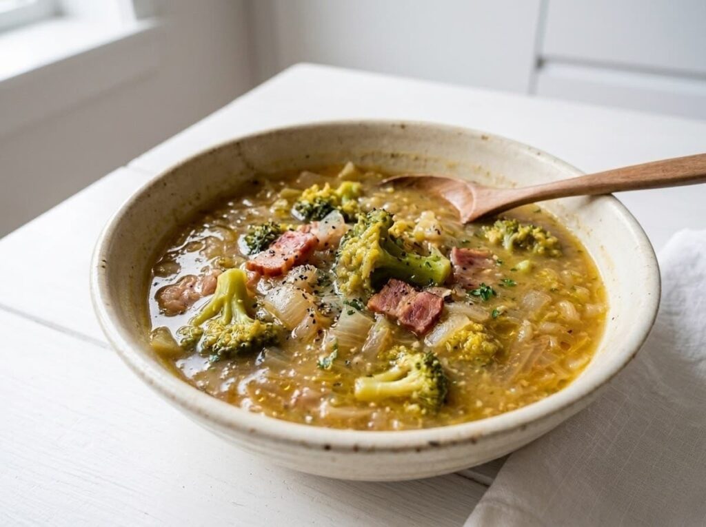 作り方は至って簡単で、沸騰したスープにベーコンや玉ねぎと一緒に冷凍ブロッコリーを入れるだけ。