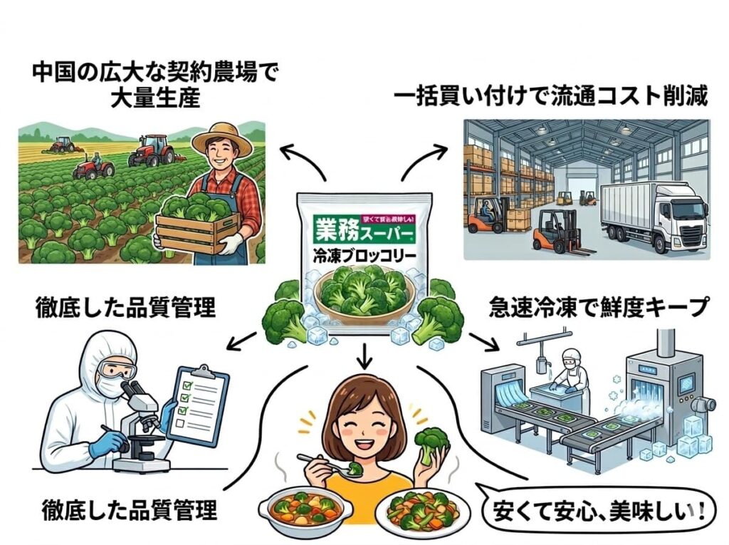 業務スーパー 冷凍ブロッコリー 値段が異常に安いため「農薬まみれで危険なのでは?」と疑う方も多いですが、安さの理由は自社の一括管理システムにあります。中国の広大な契約農場で大量栽培し、現地工場で加工から袋詰めまで行うことで、中間コストを極限まで削ぎ落としているのです。