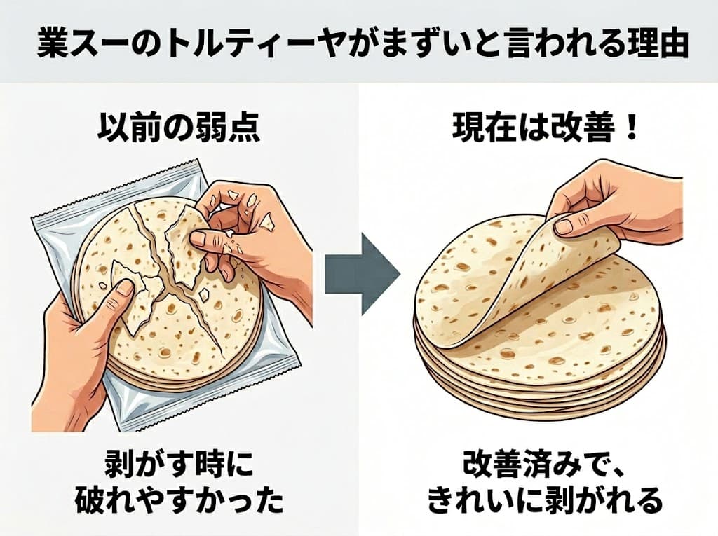 業務スーパーのトルティーヤがまずいと言われる理由は過去に販売されていた商品の「剥がすときに破れやすい」という弱点がネット上の口コミとして残っているからです。