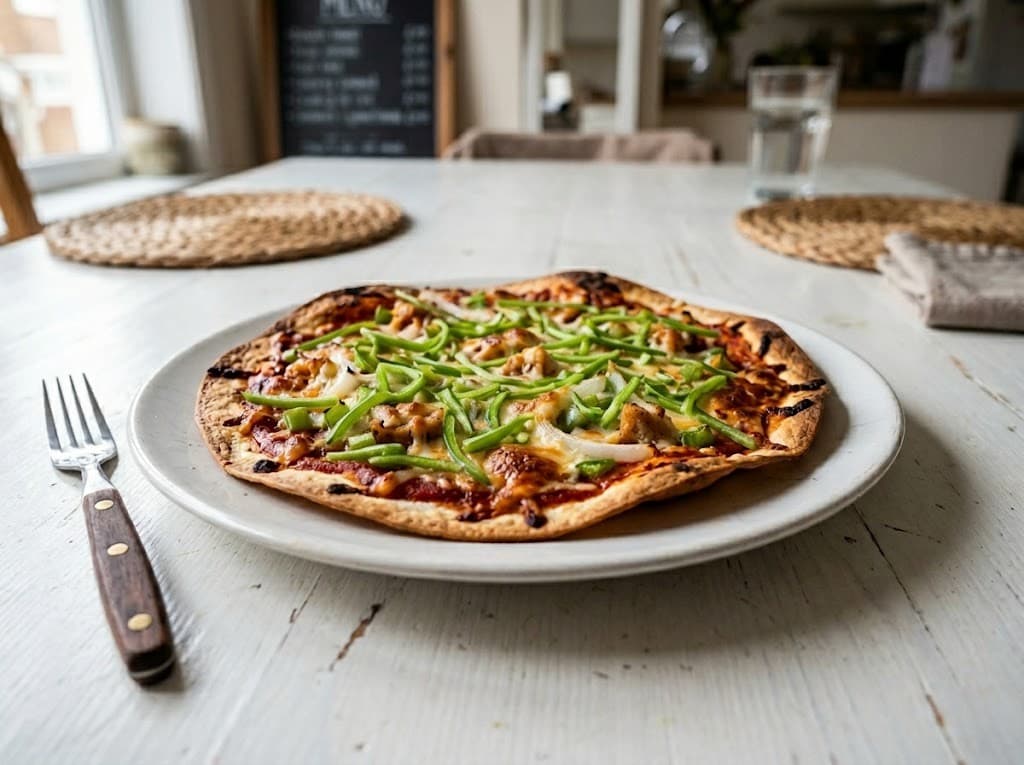 「大容量すぎて冷凍庫のスペースを圧迫している」という方にはピザ風アレンジがおすすめです。トルティーヤ生地をピザ生地の代わりに使い、ケチャップを塗ってピーマンや玉ねぎ、チーズを乗せてトースターで5分焼くだけ。